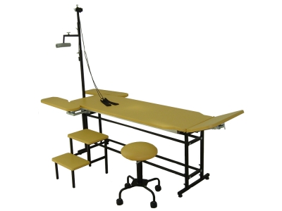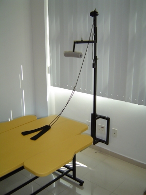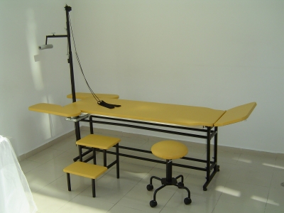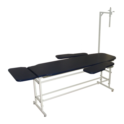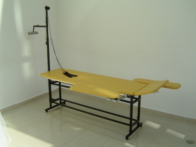 O Equipamento é constituído de uma estrutura reforçada construída em aço carbono com tubo redondo de 1” x 1,2mm e tubo quadrado de 25 x 1,5 mm com pintura epóxi. Altura é determinada pelo terapeuta através de quatro Manípulos na estrutura e determinada na montagem do produto. A estrutura é fornecida com pés com deslizador. Leito estofado em madeira MDF 15mm revestido com Eva 7mm e curvim. Possui cavas na lateral para postura sentada, Cabeceira regulável através de uma mola a gás e travessa com suportes removíveis e deslizante em toda a extensão longitudinal da mesa.