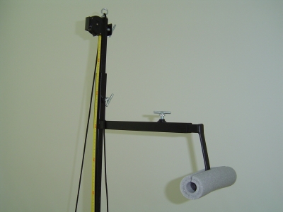 Como complemento, pode-se optar pelo modelo da foto, onde estão mostrados uma Escada de dois Degraus, uma Banqueta com Rodízios e, posicionado na haste, o Adaptador para Postura Bailarina. Outra foto mostra que o Adaptador para Postura Bailarina pode auxiliar na na Medição de Altura do Paciente, bastando para tal a colocação de uma Fita Métrica ou Trena junto ao Suporte da Haste