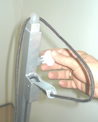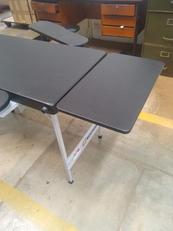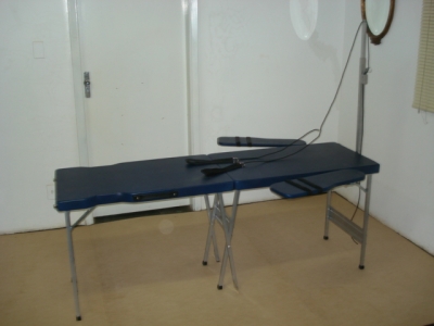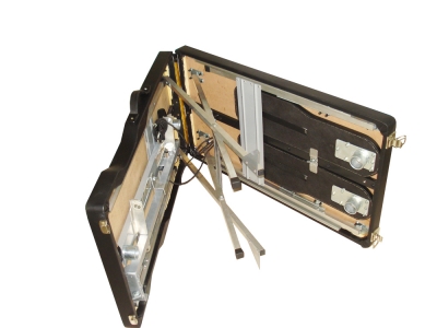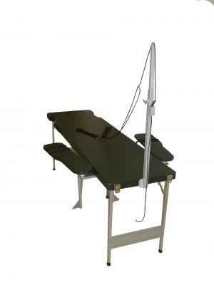Mesa Portátil com “Braços” que podem deslizar longitudinalmente através de uma estrutura em alumínio (Travessa) com "Trilhos", localizada na parte inferior do tampo. A Haste pode ser posicionada em qualquer uma das extremidades da mesa, e tem a função de prender a cinta, evitando assim a colocação de ganchos na parede. (proporciona maior mobilidade para este conjunto)