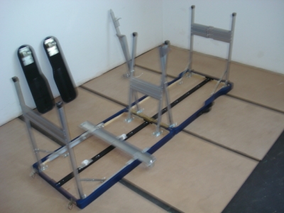 Mesa Portátil com “Braços” que podem deslizar longitudinalmente através de uma estrutura em alumínio (Travessa) com roldanas, localizada na parte inferior do tampo. A haste pode ser posicionada em qualquer uma das extremidades da mesa, e tem a função de prender a cinta, evitando assim a colocação de ganchos na parede. (proporciona maior mobilidade para este conjunto)